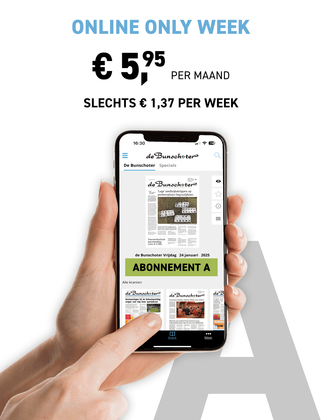 Met het Online Only abonnement van de Bunschoter heb je altijd en overal toegang tot al het nieuws uit Bunschoten en omgeving, direct op je computer, tablet of smartphone. Je leest als eerste de nieuwste artikelen, sportverslagen, interviews en achtergrondverhalen, zonder dat je hoeft te wachten op de papieren editie. Of je nu thuis bent of onderweg, met ons online abonnement blijf je altijd op de hoogte van wat er speelt in de buurt. Bovendien krijg je toegang tot exclusieve digitale content en kun je eenvoudig door het archief bladeren om eerdere edities terug te lezen.